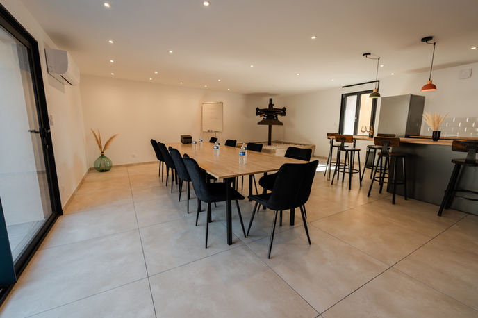 Un lieu authentique et modulable : salle équipée (bureau, vidéoprojecteur, cuisine équipée, …), espaces extérieurs (piscine, salons, terrain de pétanque, …), ambiance chaleureuse